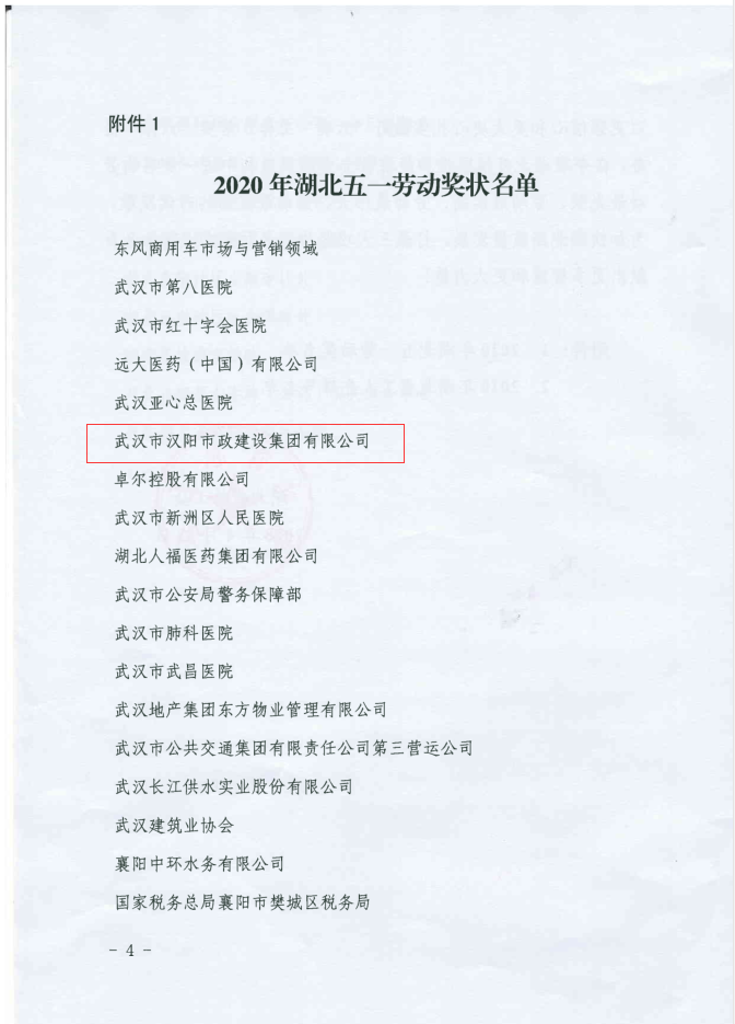 4月27日,湖北省總工會發(fā)布《關(guān)于表彰2020年湖北五一勞動獎和湖北省工人先鋒號的決定》(鄂工發(fā)〔2020〕10號),武漢市漢陽市政建設(shè)集團有限公司榮獲2020年湖北五一勞動獎狀榮譽。