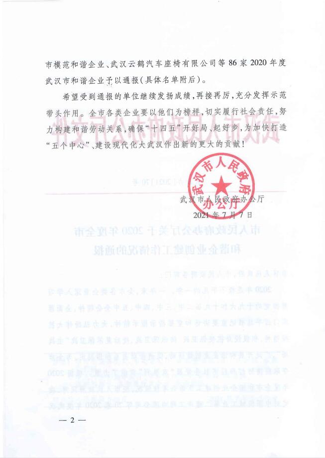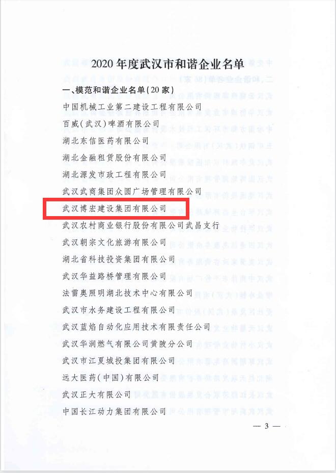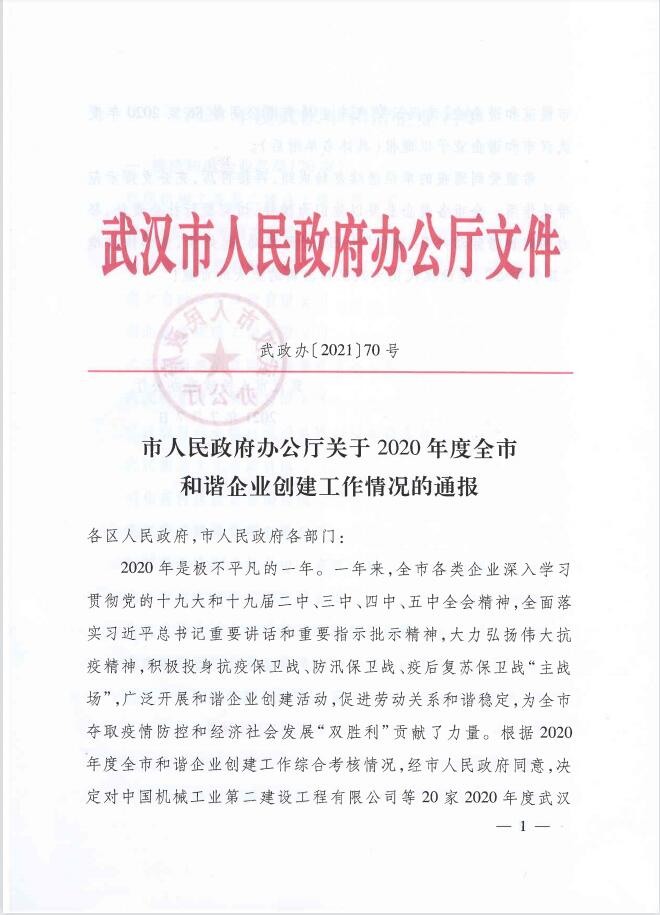 近日,根據(jù)2020年度武漢市和諧企業(yè)創(chuàng)建工作綜合考核情況,漢陽市政博宏公司獲評(píng)“2020年度武漢市模范和諧企業(yè)”榮譽(yù)稱號(hào),琴臺(tái)公司獲評(píng)“2020年度武漢市和諧企業(yè)”榮譽(yù)稱號(hào)。此前,鐘鑫公司獲“2014年度武漢市和諧企業(yè)”,集團(tuán)公司獲“2016年度武漢市模范和諧企業(yè)”,致遠(yuǎn)公司獲“2017年度武漢市模范和諧企業(yè)”,天創(chuàng)公司獲“2019年度武漢市模范和諧企業(yè)”,五公司獲“2019年度武漢市和諧企業(yè)”。截至目前,漢陽市政已有7家單位獲評(píng)“武漢市模范和諧企業(yè)”和“武漢市和諧企業(yè)”。