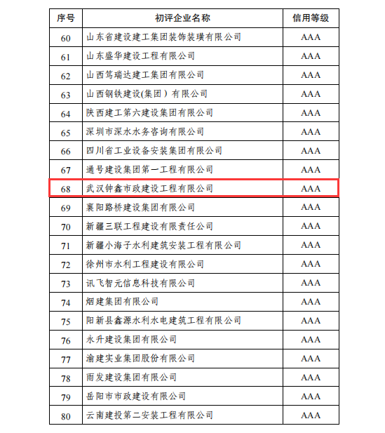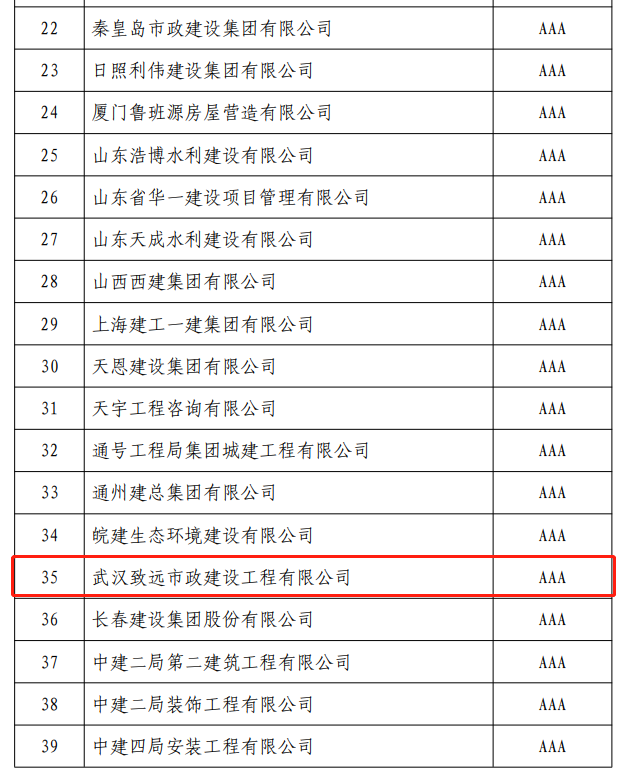 近日,中國施工企業(yè)管理協(xié)會發(fā)布,2021年度第一批、第二批工程建設(shè)企業(yè)信用評價(jià)結(jié)果名單漢陽市政鐘鑫公司、致遠(yuǎn)公司榮獲信用等級AAA級。截止目前,漢陽市政及旗下共有5家企業(yè)獲此榮譽(yù)。