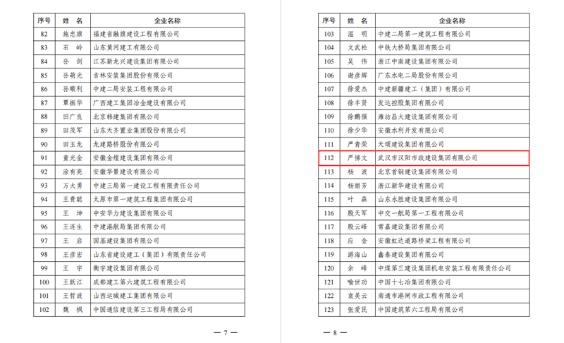 近日,中國施工企業管理協會傳來好消息,漢陽市政黨委書記、董事長嚴悌文榮獲“2021年工程建設誠信企業家”,漢陽市政七公司總工程師羅艷明榮獲“2021年工程建設誠信項目經理”。