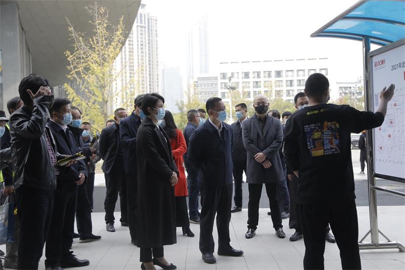 10月22日下午,武漢市委常委、副市長陳勁超,漢陽區委書記徐麗、區長范禮奎,市城建局局長、黨組書記夏平,區建設局局長胡紅勝等赴第六屆武漢設計雙年展主展館建設現場檢查指導搭建布展工作。漢陽市政黨委書記、董事長嚴悌文陪同調研。